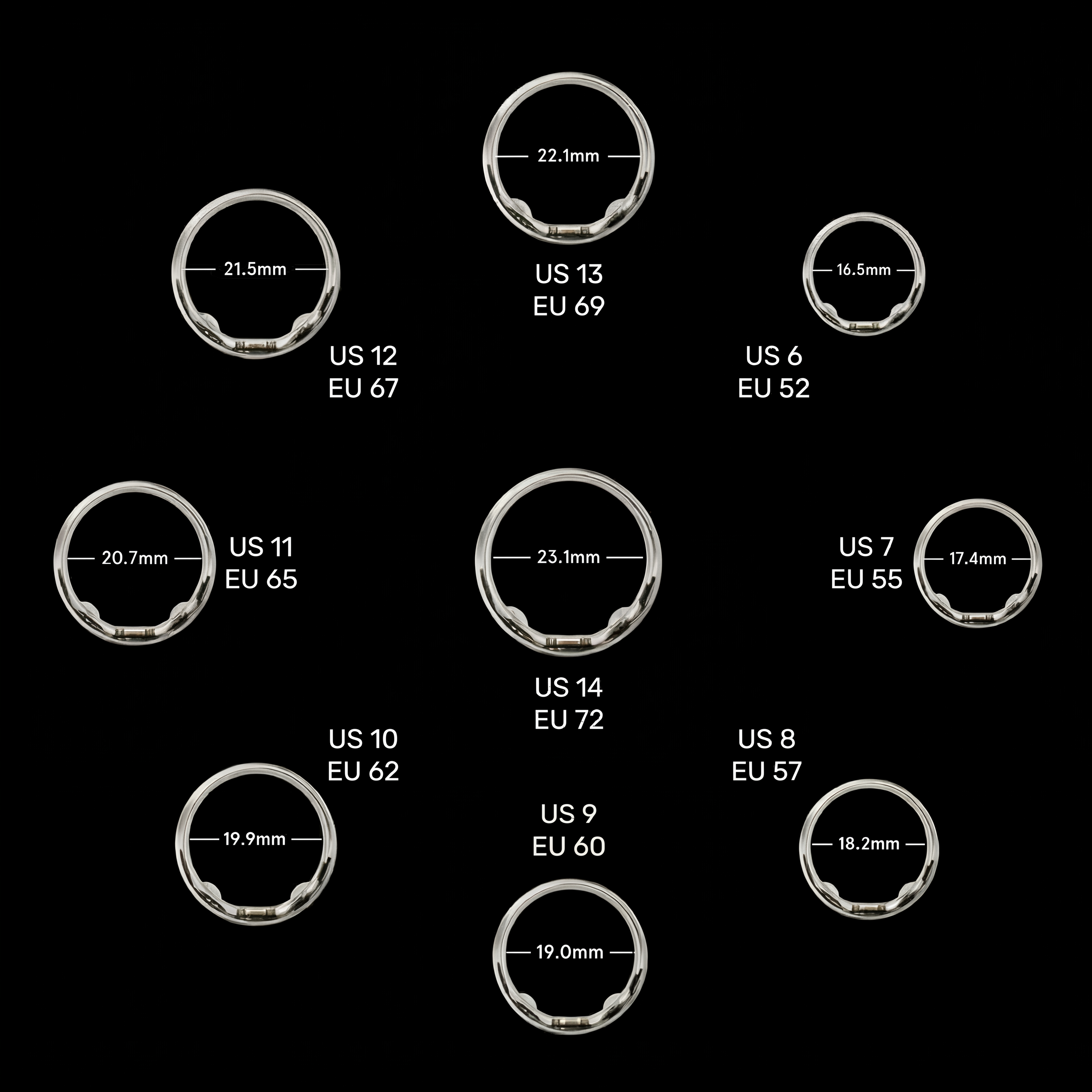 Your sizing kit includes exactly 9 different precision-molded dummy rings spanning all available sizes. Test out your preferred size over a full 24-hour cycle to guarantee absolute comfort before finalizing your real Endurance ring purchase.